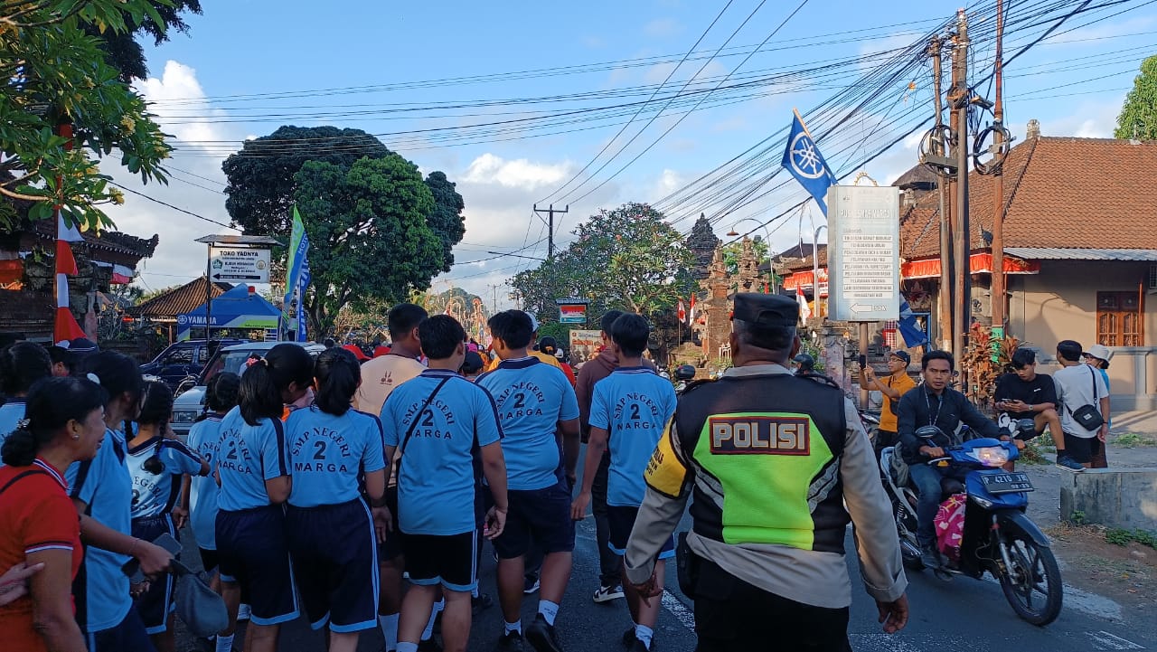 Bhabinkamtibmas Desa Kukuh Aiptu I Made Rasnu dalam kesempatan tersebut terjun langsung untuk melakukan pengamanan dan pengawalan gerak jalan masyarakat desa Kukuh.