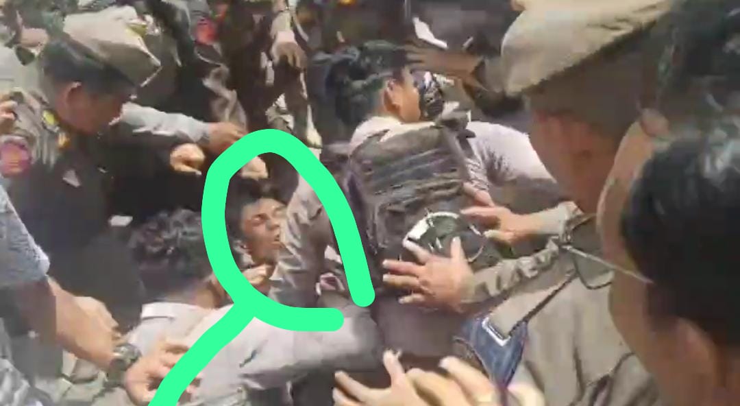 Dalam aksi itu, seorang oknum pengamanan aksi terlihat menjambak salah satu masa aksi yang menurut keterangan narasumber merupakan koordinator lapangan aksi tersebut.