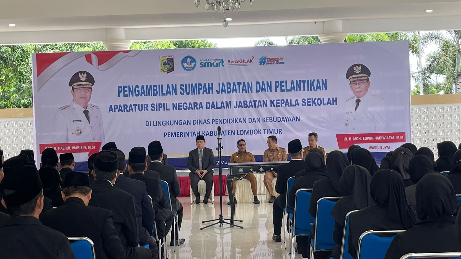 Lombok Timur, Barbareto – Kepala Sekolah (Kepsek) adalah manager tingkat satuan pendidikan yang harus mengayomi para guru, hal tersebut disampaikan Bupati Lombok Timur, H. Haerul Warisin pada saat Pengambilan Sumpah Jabatan dan Pelantikan ASN dalam Jabatan Kepala Sekolah di lingkungan Dinas Pendidikan dan Kebudayaan (Dikbud) Lombok Timur (Lotim) di aula pendopo Bupati. Senin, 2 Maret 2026.